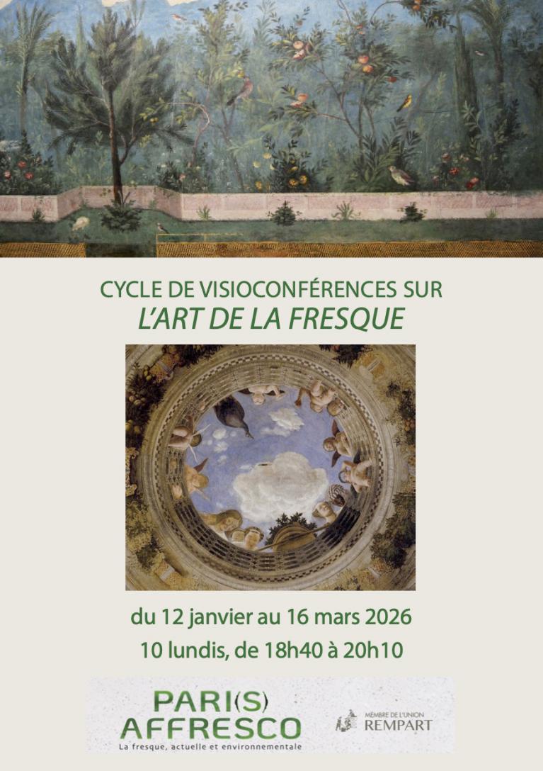 Pari(s) Affresco propose un cycle de visioconférences d’une heure trente, du 12 janvier au 16 mars 2026, 10 lundis de 18h40 à 20h10. Ces visioconférences sont menées par Isabelle Bonzom, fondatrice de Pari(s) Affresco, historienne de l'art et fresquiste.