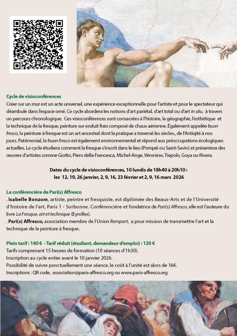 Pari(s) Affresco propose un cycle de visioconférences d’une heure trente, du 12 janvier au 16 mars 2026, 10 lundis de 18h40 à 20h10. Ces visioconférences sont menées par Isabelle Bonzom, fondatrice de Pari(s) Affresco, historienne de l'art et fresquiste.